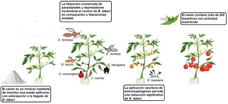 El empleo de hongos entomopatógenos registra avances significativos. Éstos presentan la capacidad de degradar la cutícula del insecto plaga a través de enzimas proteasas tales como lipasas y quitinasas, seguido por la penetración de los tubos germinativos fúngicos al interior del insecto; posterior a ello, sucede la liberación de micotoxinas [30]. Los hongos entomopatógenos disponibles en forma comercial para el control de la mosquita blanca son Beauveria bassiana, Metharhizium anisopliae y Lecanicillium lecanii. En específico, L. lecanii ha mostrado capacidad para reducir la densidad de población de B. tabaci hasta en un 60 % en cultivos de chile (Capsicum annum L.) [31]. El uso sinérgico de los enemigos naturales de B. tabaci (depredadores y parasitoides) con entomopatógenos, o insecticidas botánicos ha resultado exitoso, salvo en ciertas excepciones, ya que los entomopatógenos afectan a las poblaciones de parasitoides con relativa facilidad [32].