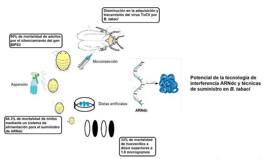 Figura 3 Tecnología de la interferencia ARNdc (doble cadena de ARN) que actualmente se utiliza para el control de B. tabaci y efectividad que se ha registrado con su aplicación (elaboración propia).
