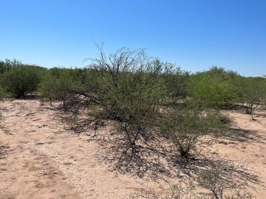 Figura 5 Campo agrícola tras más de 30 años de abandono. La trayectoria de la vegetación está influenciada por la sucesión/colonización de especies nativas, pero también de especies exóticas como el pasto buffel (Cenchrus ciliaris). Se observa el desarrollo de comunidades vegetales más complejas que en campos con menor tiempo de abandono.