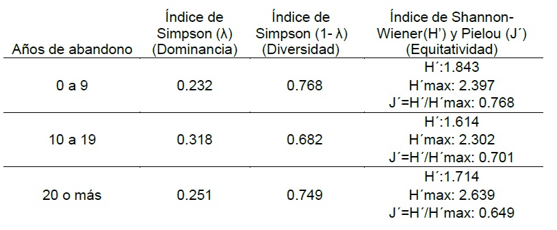 Para los cuatro intervalos de edad de abandono en los campos muestreados, los autores observaron que la mayor diversidad y equitatividad ocurren en los campos con menor (0 a 9 años) y mayor tiempo de abandono (más de 30 años). Mientras tanto, los campos en los intervalos de abandono intermedios presentan los valores de diversidad más bajos (Figura 6). Esto último se puede deber a que la dominancia de especies anuales disminuye rápidamente después de los primeros años de abandono. Por otro lado, mientras mayor es el tiempo de abandono, las especies perennes comienzan el establecimiento paulatino de comunidades vegetales más complejas, (desarrollo de los estratos arbóreos, arbustivo y herbáceo) (Figura 7).