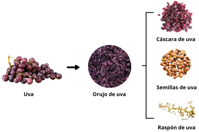 La producción masiva de vino genera varios subproductos, el orujo de uva es uno de los mayoritarios. El orujo comprende del 20 al 35 % del peso de las uvas y está constituido principalmente de cáscara, raspón, semillas y otros sólidos generados tras el prensado [39], tal como se muestra en la Figura 2. Se proyecta que por cada 100 kg de uva procesada se obtienen cerca de 25 kg de orujo [38]. La industria vitivinícola produce alrededor de 13 millones de toneladas de orujo de uva a nivel mundial; Italia, Francia y España son los principales productores [37].