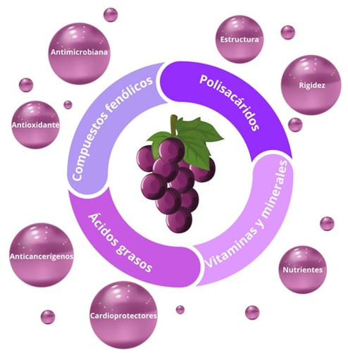 La gestión de este subproducto representa un gran desafío, ya que, su disposición en vertederos provoca efectos perjudiciales en el medio ambiente, como la contaminación del suelo y agua subterránea, la propagación de plagas en las plantas y contaminación microbiana [15]. El aprovechamiento del orujo ha sido limitado a pesar de ser un subproducto rico en compuestos bioactivos. El orujo de uva contiene principalmente polisacáridos, compuestos fenólicos, ácidos grasos, vitaminas y minerales [31], tal como se muestra en la Figura 3.