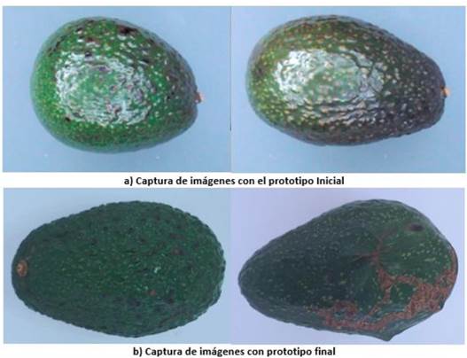 Se realizaron pruebas de obtención de imágenes digitales hasta que se disminuyó el ruido por sombra y brillo de tal manera que no interfiera en el procesamiento con los algoritmos computacionales. En la Figura 1 se presenta una comparativa de las imágenes obtenidas con el prototipo inicial y final del módulo de captura. El factor de brillo se redujo considerablemente en el resultado final, esto con la finalidad de evitar pérdida de secciones o capturar falsos positivos en los algoritmos empleados a causa del brillo excesivo.