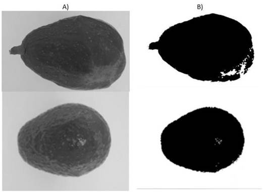 Figura 2 Binarización de las imágenes digitales de los frutos. A) Escala de grises y B) Blanco y negro.