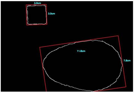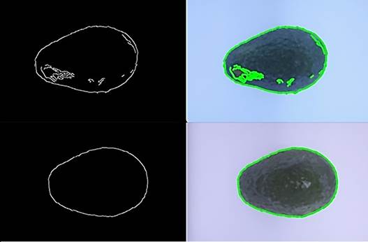 El análisis de contorno fue eficiente para identificar daño por trips y daño por roña, esto se puede apreciar en la Figura 3. Donde se observa la capacidad del método de Canny para identificar bordes, en el primer fruto se identifican daños por raspaduras y en la segunda se compara con un fruto sin daños. En ambos frutos se identifica con precisión la forma del fruto. Aplicando los métodos de binarización y Canny a las imágenes, se estimó el diámetro ecuatorial y la longitud del fruto (Figura 4).