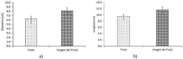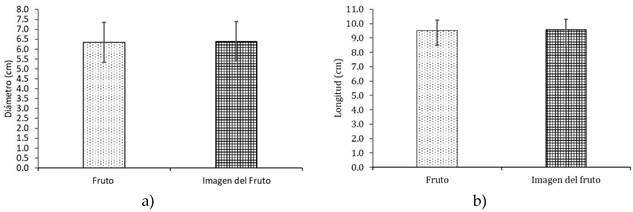 Figura 5 Comparación de las variables de tamaño del fruto y la imagen digital. a) diámetro y b) longitud.