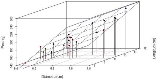 Los valores de diámetro y longitud calculados por el algoritmo se utilizaron para estimar el peso de los frutos aplicando un modelo de regresión lineal múltiple. El modelo obtenido fue Peso (g) = 32.999 * Diámetro (cm) + 13.369 * Longitud (cm) - 148.566, p < 0.01, r2 = 0.91. En la Figura 7 se observa la relación del diámetro y longitud con el peso de fruto.