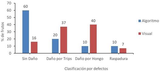 Figura 8 Clasificación de acuerdo con los defectos de los frutos comparando el método del algoritmo y la clasificación visual.