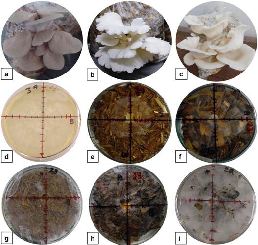 El crecimiento micelial de cada cepa, se determinó en seis tratamientos, con cuatro repeticiones. Las unidades experimentales (UE) fueron placas de Petri de 9 cm de diámetro que contenían 10 g (peso húmedo) de los siguientes sustratos que se consideraron como los tratamientos: paja de cebada (PC), hoja de caña de azúcar (HCA), hojas y tallos de Arachis pintoi (Fabaceae) (AP), rastrojo de maíz (RM), hojas de plátano (HP) y 10 mL de Papa Dextrosa Agar (PDA) (tratamiento control) (Figura 1 e, g, i, f, h y d). La humedad en los sustratos se ajustó al 65% y se esterilizaron en autoclave durante 15 min a 121 °C y 1 055 kg cm-2 de presión. Cuando las UE se enfriaron y permanecieron a temperatura ambiente (25 ± 2 °C), estas fueron inoculadas con un fragmento de 1 cm de diámetro de PDA que contenía micelio de cada cepa desarrollada durante 20 días (Gaitán-Hernández 2021). Posteriormente, las UE se incubaron en oscuridad a 25 ± 2 °C (Jaramillo-Mejía y Albertó 2013), en un periodo de 15 días. Durante la incubación; cada 24 h se midió el diámetro de crecimiento de la colonia fúngica empleando un vernier Mitutoyo® modelo estándar. Se registraron dos mediciones sobre dos rectas perpendiculares (A y B) que previamente se habían trazado en las placas de Petri; para el trazo de las rectas se tomó como punto de intersección el centro de la caja de Petri donde fue colocado el inóculo. La velocidad de crecimiento se expresó en cm día-1, bajo la expresión matemática: