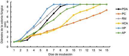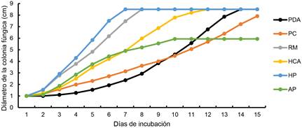 En la Figura 2, se observa el diámetro de crecimiento micelial de la cepa MXLD23 durante 15 días de incubación. Después de la inoculación de la cepa en los medios evaluados, la etapa de latencia se observó hasta el segundo día, en el cual, la cepa mostró diferente adaptación respecto al diámetro de crecimiento en cada tratamiento, se encontraron diferencias Gl = 5, H = 42.57 y p-valor = <0.0001) (Tabla 1). La etapa exponencial fue entre el tercer y sexto día (Figura 2); en esta etapa, el crecimiento de la cepa en los tratamientos RM y HP fue mayor y estadísticamente diferente al resto de los tratamientos: día 3 (Gl = 5, H = 41.31 y p-valor = < 0.0001), día 4 (Gl = 5, H = 40.79 y p-valor = < 0.0001), día 5 (Gl = 5, H = 42.76 y p-valor = < 0.0001) y día 6 (Gl = 5, H = 44.21 y p-valor = < 0.0001) (Tabla 1). Las UE con HP, fueron colonizadas por la cepa en siete días, con RM en ocho días, con PDA en nueve días, con AP en 11 días y con HCA en 14 días. Las UE con PC no fueron colonizadas completamente alcanzando un crecimiento máximo de 7.3 cm de diámetro (Figura 2).