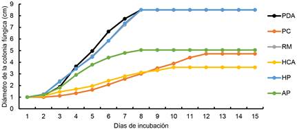 El mayor promedio de crecimiento de la cepa MXLD24 se observó en el sustrato HP con 1.22 cm día-1; mientras que, el menor valor fue en el tratamiento control PDA con 0.27 cm día-1 (Tabla 4). El valor de R2 del modelo evaluado resultó en intervalo de 0.9 a 0.99. De acuerdo a LS de m, la velocidad de crecimiento de la colonia fúngica de la cepa MXLD24, podría incrementar en PDA, PC, RM, HCA, HP y AP con crecimiento promedio de 0.1, 0.03, 0.09, 0.11, 0.2 y 0.11 cm día-1 respectivamente. Las tasas de crecimiento en HP y RM superaron tres veces la tasa de crecimiento la cepa en PC.