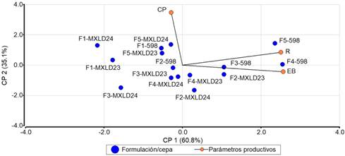 El análisis de componentes principales mostró que el 95.9% de la variación producida es explicada por el componente principal 1 y 2. El vector EB presentó mayor aporte al componente principal 1 y el vector CP al componente 2 (Figura 5). Un efecto positivo se encontró entre la cepa 598 cultivada en F4 y F3 en relación a la EB. La EB de la cepa MXLD23 fue sobresaliente en F2. La cepa 598 cultivada en F5 se caracterizó fuertemente con el R, esto representó mayor ganancia en peso seco de esporomas de la productividad obtenida. Las cepas MXLD24 cultivada en F5, MXLD23 cultivada en F5 y 598 cultivada en F1, se caracterizaron por presentar mayores ciclos de producción. La cepa MXLD24 cultivada en F2 y la cepa MXLD23 cultivada en F4 presentaron una relación directa al presentar los menores ciclos de producción.