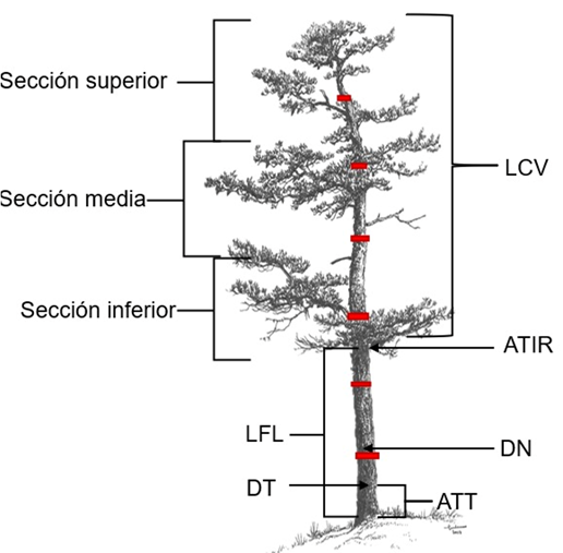 Figura 2 Diagrama del muestreo destructivo. LCV = longitud de copa viva (m), LFL = longitud de fuste limpio (m), DT = diámetro de tocón (cm), DN = díametro normal (cm), ATIR = altura de inserción de rama viva (m), ATT = altura de tocón (m).