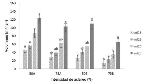 Figura 3 Comportamiento del volumen durante aclareos secuenciales. Área basal alta (A ≥ 14 m2 ha-1) y baja (B < 14 m2 ha-1). Valores con letras distintas y por año muestran diferencias estadísticas significativas (Duncan, 0.05); las líneas verticales sobre las barras representan el error estándar (n = 174 árboles).