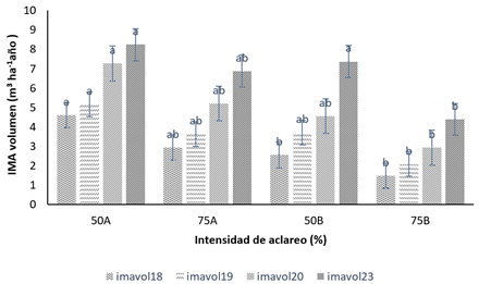 Figura 4 Incremento medio anual (IMA) de volumen en cinco años de aclareos secuenciales. Intensidad de aclareo de 50 y 75% en sitios con área basal alta (A ≥ 14 m2 ha-1) y baja (B < 14 m2 ha-1) densidad. Valores con la misma letra y por año no presentan diferencias estadísticas significativas (Duncan, 0.05); las líneas verticales sobre las barras representan el error estándar (n = 174 árboles).