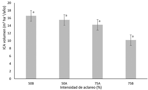 Figura 5 Incremento corriente anual (ICA) de volumen durante la aplicación de aclareos (2018-2023). Área basal alta (A ≥ 14 m2 ha-1) y baja (B < 14 m2 ha-1). Valores con la misma letra no presentan diferencias estadísticas significativas (Duncan, 0.05); las líneas verticales sobre las barras representan el error estándar.