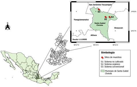 Figura 1 Ubicación geográfica del municipio de Santa Isabel Cholula, Puebla, México, del sistema de referencia y los sistemas de producción de cebolla estudiados. S1 sistema no cultivado (SNC), S2 sistema orgánico (SORG) y S3 sistema convencional (SCV) de producción de cebolla.