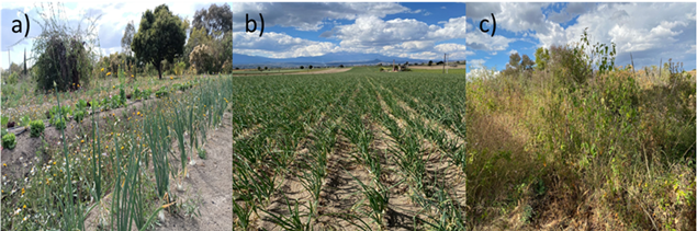 Figura 2 Sitios seleccionados para la colecta de agua de pozo usada para riego en un sistema de producción orgánico (a) y en un sistema convencional de cebolla (b), y sitio para la colecta de agua de un sistema natural o no cultivado (c) en el municipio de Santa Isabel Cholula, Puebla, México.