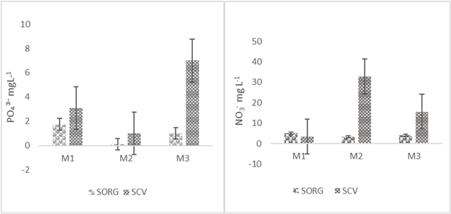 Figura 3 Diferencia en contenido de fosfatos y nitratos en el agua usada en el sistema orgánico (SORG) y en el sistema convencional (SCV) en comparación con el agua del sistema no cultivado (SNC en eje x), en tres muestreos en Santa Isabel Cholula, Puebla, México. M1 primer muestreo 28 de octubre de 2020, M2 segundo muestreo 10 de enero de 2021, M3 tercer muestreo 15 de abril de 2021.