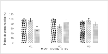 Figura 4 Índice de germinación (IG) de semillas de rábano calculado en el agua en dos sistemas de producción de cebolla y en un sistema no cultivado en Santa Isabel, Cholula Puebla, México. SNC sistema no cultivado, SORG sistema orgánico y SCV sistema convencional de producción de cebolla, durante tres muestreos. M1 muestreo 28 de octubre de 2020, M2 muestreo 10 de enero de 2021, M3 muestreo 15 de abril de 2021.