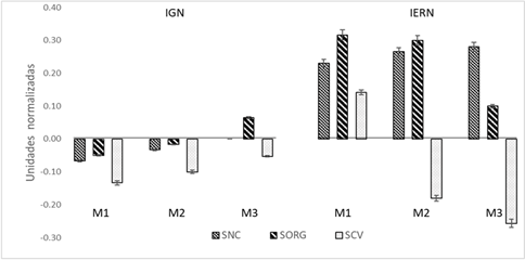 Los valores de IGN con el agua del sistema no cultivado y del sistema orgánico muestran valores de 0 y 0.4 (Figura 5). El IERN se presentó con valores de baja toxicidad para el agua proveniente del sistema no cultivado y del sistema orgánico, con valores de 0.25 y 0.24 respectivamente, mientras que el agua del sistema convencional alcanzó índices de toxicidad moderada (-0.30) (Figura 5). Se destaca que los valores de IGN e IERN fluctuaron dependiendo del tipo de agua y fecha de muestreo. Con valores más negativos de IGN en el muestreo de octubre, y de IERN en los muestreos de enero y abril en el SCV, en comparación con el SORG y el SNC (Figura 5).
