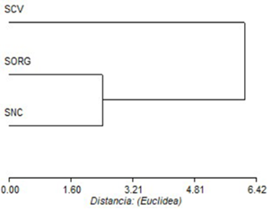 Al realizar el análisis de conglomerados se confirmó un agrupamiento con características similares entre el agua del SNC y el SORG, y separados de las características del agua usada en el SCV (Figura 6). Con un componente principal (CP1) que explica el 84% de la variabilidad y donde las variables con mayor influencia fueron pH (-0.34), nitratos (0.3), fosfatos (0.34), IGN (-0.33), CE (-0.30) e IERN (0.64).