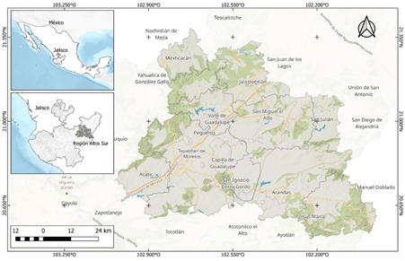 El estudio se realizó en la región de Los Altos del estado de Jalisco, México. Se incluyeron 22 establos lecheros con características tecnológicas y socioeconómicas del sistema de producción familiar (Avilés et al. 2024) o también conocido como pequeña escala (Montiel-Olguín et al. 2019). Los establos estaban distribuidos entre los municipios de Tepatitlán de Morelos, San Ignacio Cerro Gordo y Valle de Guadalupe (Figura 1). En el área de estudio, el clima es templado subhúmedo, con temperatura media de 19.0 °C y precipitación media anual de 753 mm, concentrada entre los meses de junio a septiembre (CEAJ 2023).