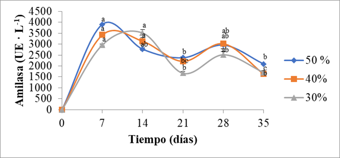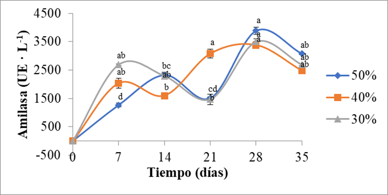 En los sustratos compuestos por paja de trigo combinada con maguey (Figura 2) la mayor actividad amilasa fue detectada a los 28 días del cultivo del hongo, de acuerdo al ANOVA se obtuvo diferencia significativa entre los tratamientos a los 28 días (p<0.05). El hecho de que la mayor producción de amilasas se diera casi al final del periodo de cultivo del hongo puede deberse a que los azucares solubles son los principales consumidos durante el desarrollo del micelio [35]. El bagazo de maguey es un sustrato con una alta concentración de azucares reductores (5559.2 mg · L-1) [36], cuando disminuye la concentración de azucares en el medio, aumenta la producción de otras enzimas hidrolíticas. La mayor actividad alcanzada fue de 3889 UE · L-1 en el sustrato compuesto de paja de trigo combinada con maguey al 50%. Se han reportado niveles de producción de enzima amilasa alrededor de 495 UE · L-1 a los 21 días de la cinética de fermentación, sin embargo, en el presente estudio se obtuvieron mayores niveles (3889 UE · L-1), debido a efectos sinérgicos que pueden presentar los microorganismos en sistemas de fermentación sólida [29].