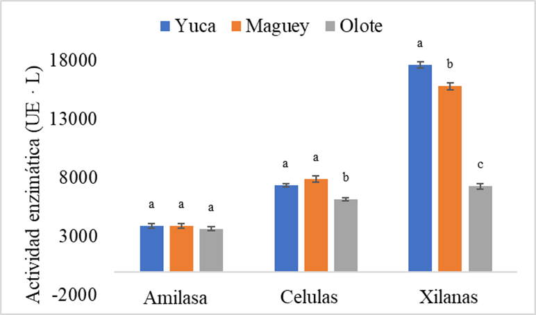 La composición química de cada mezla de sustrato está estrechamente relacionada con la producción enzimática del hongo P. ostreatus. No hubo diferencia significativa en la producción de amilasa en los tres residuos utilizados como sustrato. En el caso de la celulasa, se obtuvo mayor rendimiento de producción de la enzima en los sustratos que contenían maguey y yucca. Mientras que se obtuvieron mejores resultados en la producción de xilanasas en las mezclas de sustrato que contenían yucca.