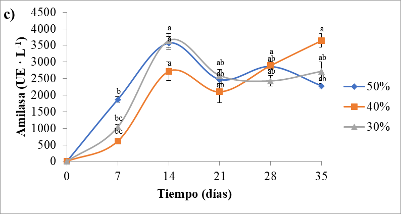 En los sustratos compuestos por paja de trigo y olote de maíz (Figura 3) se presentó un crecimiento exponencial de los 0 a los 28 días, alcanzando su pico máximo al final de este periodo en los sustratos que contenían olote al 30 y 50%, de acuerdo al análisis de varianza ANOVA se obtuvo diferencia significativa entre los 3 tratamientos (p<0.05). Los sistemas heterogéneos, compuestos por uno o más sustratos, favorecen el efecto sinérgico, alcanzando su mayor actividad ente los 20 y 30 días de la fermentación, debido a que el microorganismo induce la activación de diversas rutas metabólicas (ej. glucólisis, gluconeogénesis), en consecuencia, se acelera el aprovechamiento de cada una de las fuentes de carbono presentes [34]. En el sustrato con olote al 40%, se presentó un pico de actividad amilasa a los 14 días, posteriormente descendió a los 21 días, mostrando después un crecimiento exponencial y alcanzando la mayor actividad enzimática a los 35 días del experimento. El olote de maíz está compuesto en su mayoría por celulosa, hemicelulosa y lignina [14], lo cual puede inhibir la actividad amilasa durante los primeros días de la cinética de fermentación, sin embargo, la acción de otros complejos enzimáticos puede liberar azúcares más simples que pueden inducir la actividad amilasa durante los últimos días de la cinética de fermentación [37]. La actividad enzimática máxima en cada uno de los sustratos que contenían olote fue muy similar, presentándose una actividad de 3572 UE · L-1 en el sustrato con 50% de olote y 3650 UE · L-1 en los sustratos que lo contenían en un 30 y 40%.