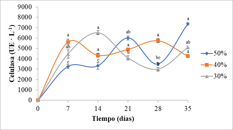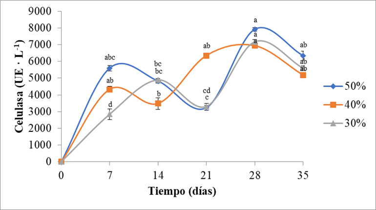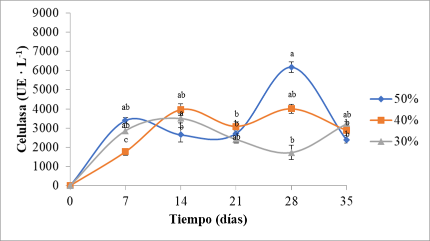 En la Figura 4 se puede observar el comportamiento cinético de la celulasa en los sustratos que contenían paja de trigo y yucca, el cual fue muy variado dependiendo de la proporción utilizada. Los mecanismos de producción de la enzima celulasa, varían ampliamente dependiendo de la constitución de los materiales, mostrando mayores rendimientos en algunos sistemas [37]. En el sustrato que contenía yucca en un 30%, la mayor actividad celulasa (6514 UE · L-1) fue alcanzada a los 14 días de cultivo, sin embargo, después se presentó un descenso de actividad hacia los 28 días y nuevamente un crecimiento exponencial que se mantuvo hasta el final del periodo de fermentación. En el tratamiento con yucca al 40% se presentaron dos picos de actividad enzimática, el primero a los 7 días (5618 UE · L-1) seguido por una disminución de la actividad a los 14 días, posteriormente volvió a aumentar hasta alcanzar su actividad máxima a los 28 días (5750 UE · L-1). Finalmente, el sustrato con 50% de yucca fue el que presentó mayor actividad celulasa, esto puede deberse a su importante contenido de fibra (85 g · kg-1) [10]. En el sustrato con mayor proporción de yucca, se exhibió un crecimiento exponencial a partir del inicio de la fermentación hasta los 21 días, y después se presentó un descenso notable de la actividad enzimática a los 28 días y creciendo nuevamente hasta alcanzar un máximo de actividad enzimática (7360 UE · L-1) a los 35 días. En un estudio desarrollado para obtener enzima celulasa, utilizando paja de sorgo como soporte por fermentación sólida utilizando P. ostreatus se reportó un comportamiento similar, presentándose un crecimiento exponencial hasta los 21 días, sin embargo no se evaluó la producción enzimática en los días posteriores de la fermentación [29].