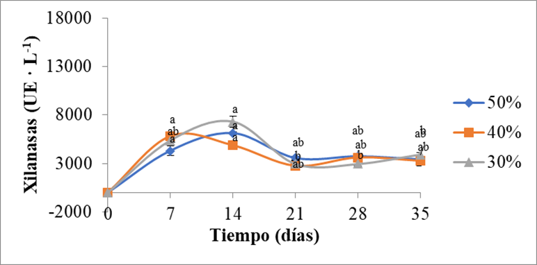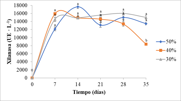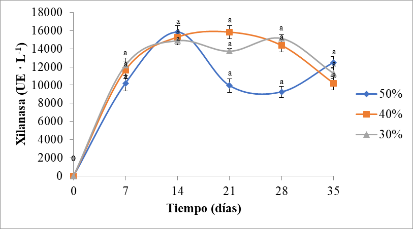 En la Figura 7 se puede observar la cinética de la actividad xilanasa en las diferentes mezclas de paja de trigo y yucca. Se observó un crecimiento exponencial en los tres tratamientos a partir del inicio de la fermentación hasta los 7 días en los tratamientos con yucca al 30 y 40%. De la misma manera, en un estudio realizado utilizando cáscara de sandía, se reportó un incremento gradual de la actividad xilanasa hasta los siete días de la fermentación, sin embargo, después de este tiempo se observó una reducción en su rendimiento de producción [40]. En el sustrato con yucca al 50%, el crecimiento exponencial se prolongó hasta los 14 días, al final de los cuales se observó el pico máximo de actividad. En un trabajo previo desarrollado utilizando P. ostreatus, se obtuvo la actividad máxima de enzima xilanasa a los 21 días de la cinética de fermentación, debido a que la cinética de producción enzimática puede variar dependiendo de la composición de los sustratos [29]. En el sustrato con yucca al 30%, la mayor actividad enzimática no se presentó en el primer pico como en los otros tratamientos, a éste le siguió una disminución de la actividad enzimática y posteriormente un incremento, alcanzando su mayor actividad a los 28 días de la fermentación. El sustrato con mayor proporción de yucca fue en el que se presentó la mayor actividad xilanasa (17636 UE · L-1). En otro estudio, realizado en Aspergillus niger, en el cual utilizaron, sustratos con alto contenido de materiales lignocelulósicos, tales como, cáscara de arroz y salvado de trigo, en una relación del 50%, se reportaron niveles altos de producción de enzima xilanasa [6].