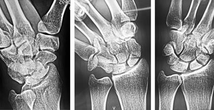 Figura 1: Radiografías preoperatorias que muestran trazo de fractura simple a nivel de la cintura del escafoides.