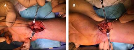 Figura 2: Fotografías transoperatorias. Abordaje volar para escafoides que permite visualizar tanto escafoides como radio distal. A) Se observa trazo de fractura a nivel de escafoides. B) Radio distal posterior a la toma de autoinjerto esponjoso.