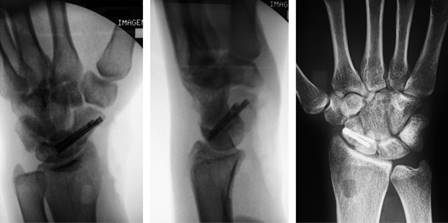 El abordaje que se usó en los cuatro casos fue el volar y se utilizaron tornillos canulados ExtremiFix (OsteoMed, Addison, Texas). El diámetro de los tornillos empleados fue de 2.0, 2.4 y 3.0 mm y su longitud de 16-28 mm, de acuerdo con la selección del cirujano que realizó el procedimiento.