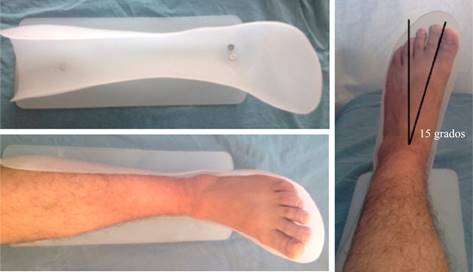 Figura 2:Muestra en tres imágenes el dispositivo diseñado (para tobillo izquierdo), manteniendo el tobillo en la posición deseada, 90 grados de dorsiflexión y 15 grados de rotación interna.