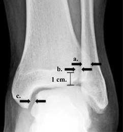 Figura 3: Proyección radiográfica anteroposterior de tobillo izquierdo que muestra las mediciones radiográficas utilizadas para lesión de la sindesmosis tibioperonea, incluyendo superposición tibioperonea (A), espacio tibioperoneo (B) y espacio tibio-astragalino medial (C)