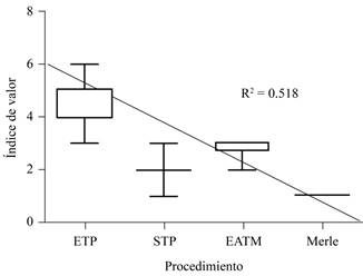 Para poder demostrar la correlación una vez aplicado el análisis de Pearson, se revisa la regresión lineal donde se obtiene un valor de R2 de 0.518, lo que muestra que sí existe dispersión, siendo el rango máximo de confianza para la revisión de Pearson de 95% y con índice de error de 5%. El valor sumario de F fue de 1.734, lo que muestra que existe correlativa entre las mediciones obtenidas (Figura 5).