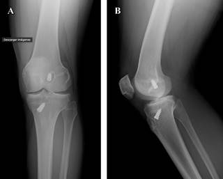 Figura 1: A) Radiografías anteroposterior y B) lateral a 30o, en las cuales se observan cambios quirúrgicos con tunelización del cruzado anterior con tornillos de fijación, el tornillo colocado en el cóndilo femoral muestra área radiolúcida a su alrededor que sugiere probable aflojamiento. Cambios quirúrgicos a nivel de la tuberosidad anterior de la tibia.