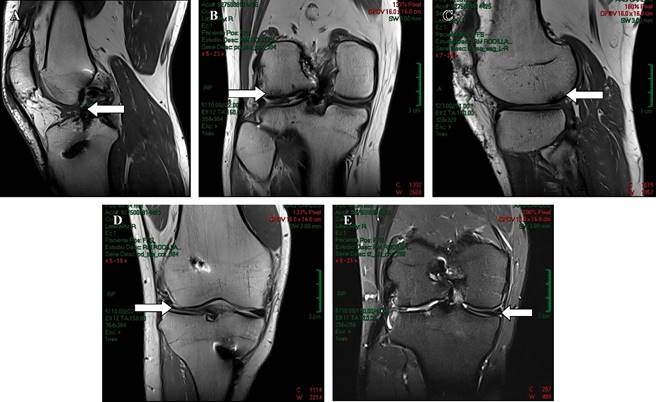 Figura 2: A) Resonancia magnética simple de rodilla derecha en un corte sagital en secuencia T1 en la que se observa injerto de ligamento cruzado anterior adelgazado (flecha blanca) de aproximadamente 5.65 mm de grosor. B) Resonancia magnética simple de rodilla derecha en un corte coronal y C) sagital en secuencia T1, en las cuales se observan lesiones condrales con zonas de delaminación (flechas blancas) localizada al compartimento femorotibial lateral. D) Resonancia magnética simple de rodilla derecha en un corte coronal en secuencia T1 que muestra remanente posterior a meniscectomía lateral (flecha blanca). E) Resonancia magnética simple de rodilla derecha en un corte coronal en secuencia T2, se observa desgarro oblicuo en la unión del cuerpo con el cuerno posterior del menisco medial (flecha blanca).