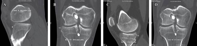 Figura 3: A) Tomografía computarizada de rodilla derecha en un corte sagital y B) coronal en las cuales se mide la plataforma tibial lateral en 50 mm en el plano AP y 39.5 mm en el plano laterolateral. C) Tomografía computarizada de rodilla derecha en un corte sagital y D) coronal en las que se mide la plataforma tibial medial en 54.8 mm en el plano AP y 31.7 mm en el plano laterolateral.