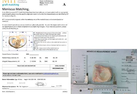 Con base en hallazgos radiológicos y características demográficas de nuestro paciente, existen pocas opciones terapéuticas que nos ayuden a evitar la progresión y osteoartritis del compartimento femorotibial lateral debido a antecedente de meniscectomía. Por todo lo mencionado, se decide que el trasplante meniscal en este caso en específico es una opción terapéutica válida y viable para evitar la progresión de la osteoartritis del compartimento femorotibial lateral. Para solicitar el aloinjerto de platillo tibial con menisco, se llevan a cabo mediciones radiológicas en tomografía computarizada de ambas plataformas tibiales de la rodilla derecha, la lateral (Figuras 3A-B) y la medial (Figuras 3C-D). Una vez hechas las medidas, se mandan al banco de aloinjertos y se lleva a cabo el «meniscus matching» para encontrar dentro de la disponibilidad del banco aquel aloinjerto con mayor compatibilidad y que más se asemeje morfológicamente al menisco nativo del paciente (Figura 4).