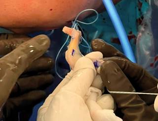 Figura 6: Aloinjerto de menisco lateral extraído de la plataforma tibial y preparado con pastillas óseas en ambas raíces meniscales. Se rotulan ambas raíces meniscales anterior y posterior para su orientación intraarticular en visión artroscópica.