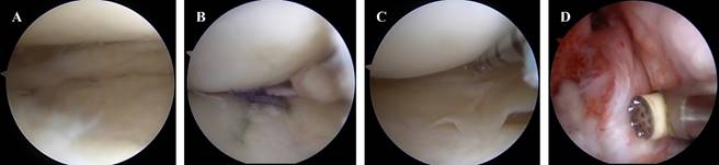Figura 8: A) Imagen artroscópica del compartimento femorotibial lateral en el que se observa ausencia prácticamente total del menisco lateral y B) posterior colocación del aloinjerto meniscal en el compartimento femorotibial lateral fijo mediante suturas meniscales a la periferia de la cápsula articular. C) Imagen artroscópica de lesión horizontal en la unión del cuerpo con el cuerno posterior del menisco medial y momento de la reparación mediante dos suturas meniscales con técnica todo dentro. D) Imagen artroscópica de autoinjerto de ligamento cruzado anterior, el cual, posterior a evaluación transquirúrgica con ganchito palpador y mostrándose competente, se tensa por medio de radiofrecuencia.