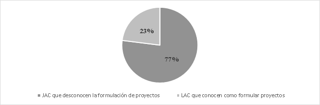 La debilidad en la institucionalidad se refleja en la falta de planeación de la gestión para la presentación de proyectos con impacto social, articulado desde las juntas de acción comunal hacia las entidades públicas. Donde se observa de acuerdo con la revisión teórica que el 77% de los comunales no conocen como gestionar proyectos ante la alcaldía Municipal de Funza Cundinamarca (gráfico 3).