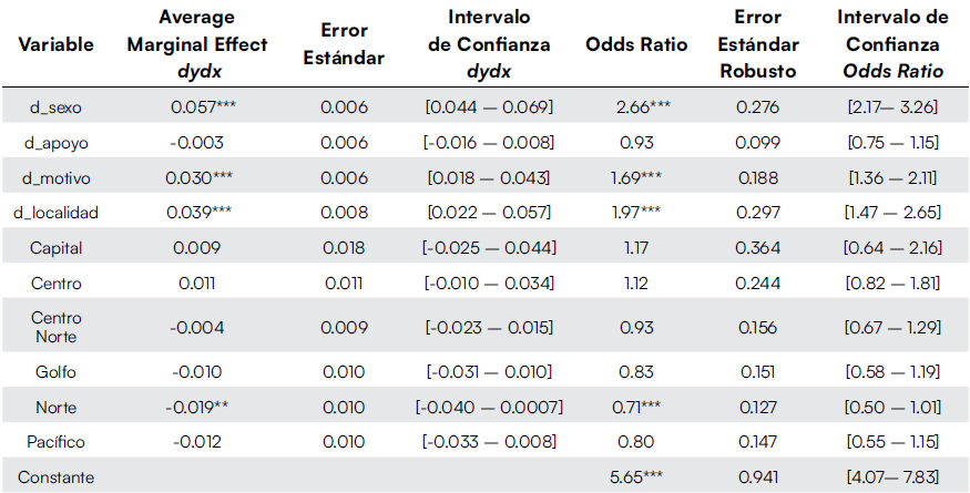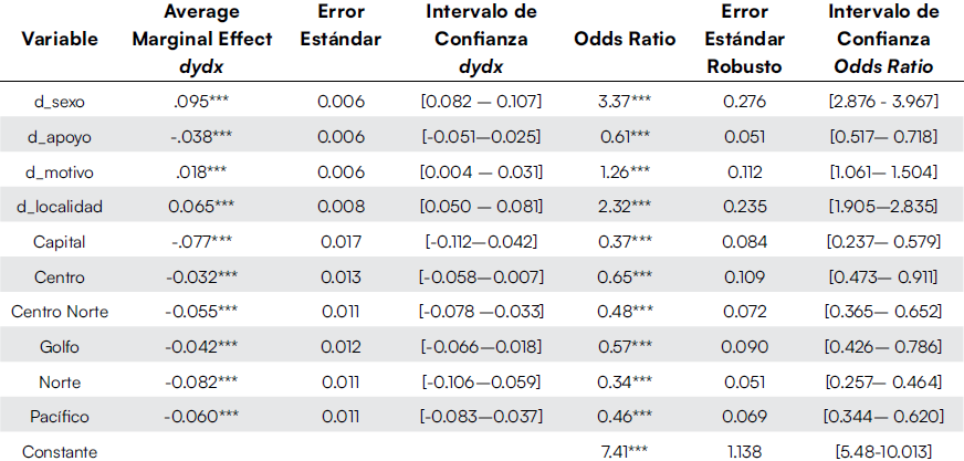 | Variable | Average Marginal Effect dydx | Error Estándar | Intervalo de Confianza dydx | Odds Ratio | Error Estándar Robusto | Intervalo de Confianza Odds Ratio |