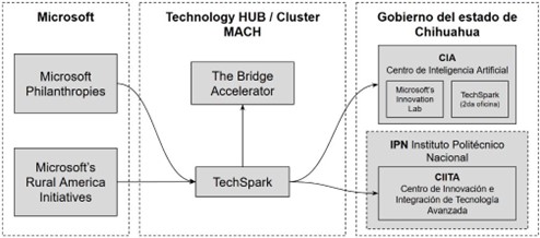 TechSpark colabora estrechamente con el Centro de Inteligencia Artificial (CIA) en Juárez, donde también establece una segunda sede, siendo este uno de los tres laboratorios de innovación en México anunciados en 2019 por el CEO de Microsoft, lo que refuerza el desarrollo tecnológico binacional. A través de estas iniciativas, TechSpark promueve el uso de tecnologías de Microsoft entre emprendedores y PyMEs, formando talento y empresas que adoptan sus herramientas, lenguajes de programación y soluciones, consolidando así su ecosistema en sectores clave (Matus-Ruiz et al., 2023).