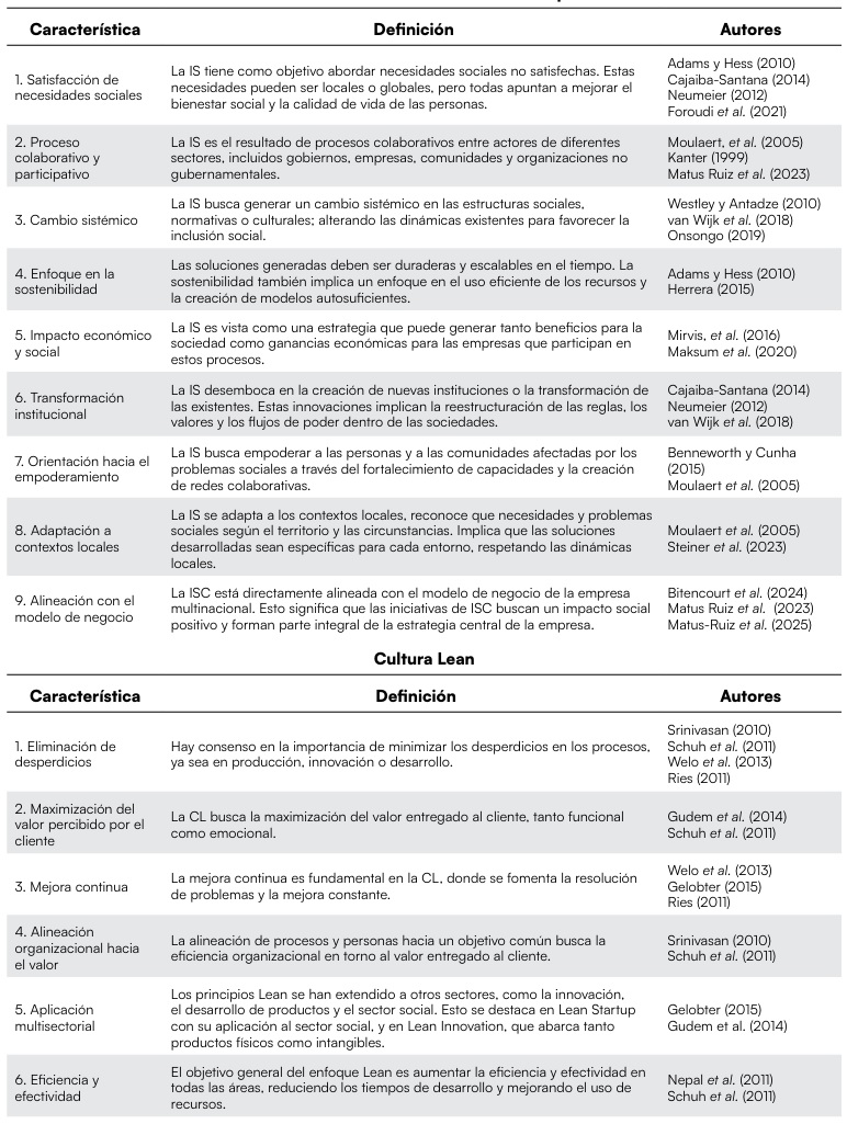 Tabla 1 Características clave de Innovación Social, Innovación Social Corporativa y Cultura Lean Innovación Social e Innovación Social Corporativa