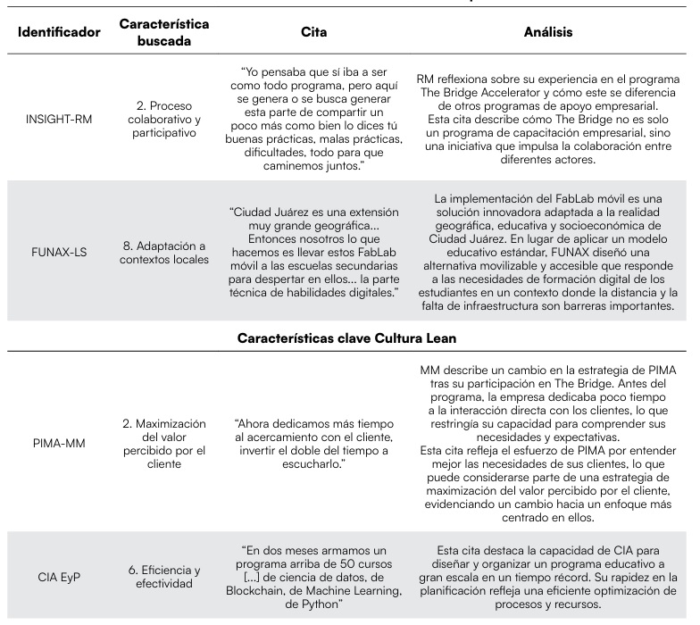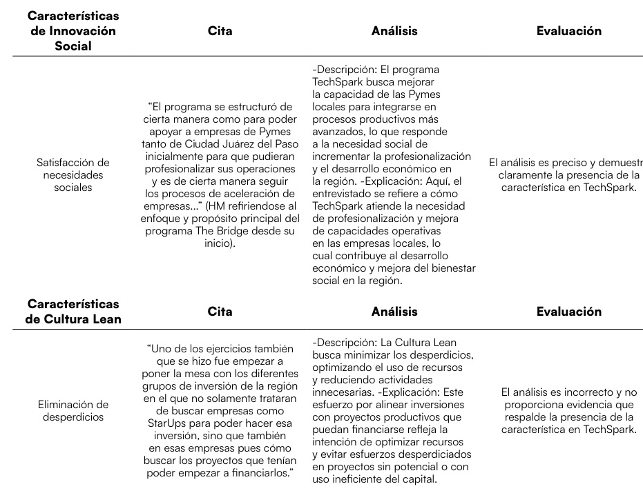 A partir del análisis de las 11 entrevistas revisadas, los resultados se organizaron en función de las características evaluadas: Innovación Social Corporativa (ISC) y Cultura Lean (CL). Además, se consideró si la entrevista correspondía a miembros de TechSpark o a representantes de las empresas beneficiarias del programa The Bridge Accelerator. La Tabla 2 presenta un extracto de los resultados obtenidos mediante el análisis asistido por IA. En este se incluye el identificador de cada entrevista, la característica analizada, la cita textual extraída y el análisis derivado de dicha cita, el cual explica por qué la característica evaluada está presente en TechSpark o en las empresas beneficiarias, según corresponda.