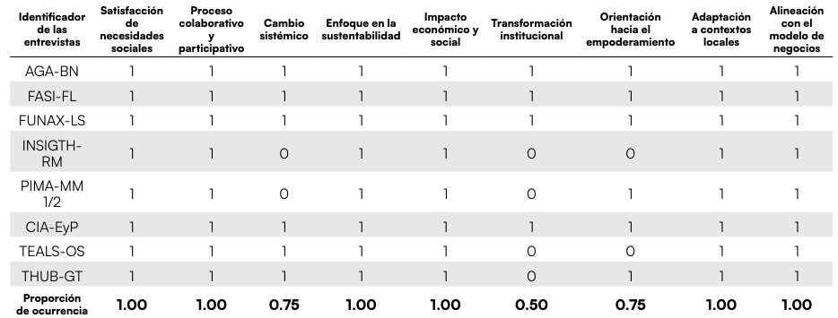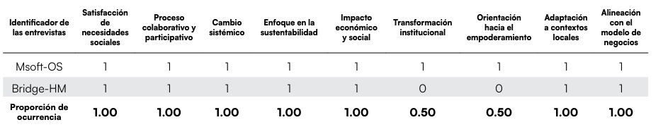 | Identificador de las entrevistas | Satisfacción de necesidades sociales | Proceso colaborativo y participativo | Cambio sistémico | Enfoque en la sustentabilidad | Impacto económico y social | Transformación institucional | Orientación hacia el empoderamiento | Adaptación a contextos locales | Alineación con el modelo de negocios |